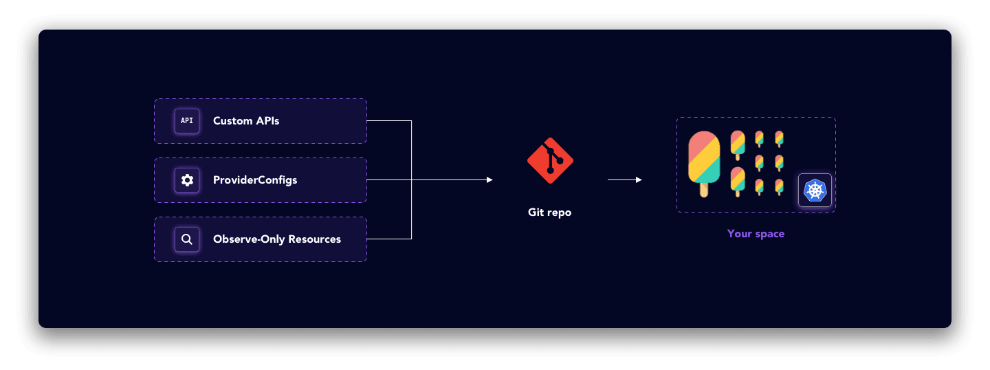 We’re expanding the capabilities of Upbound’s built-in Git integration to support deploying all Crossplane resource types. In addition to deploying XRDs and compositions, you can now deploy “runtime” configurations like ProviderConfigs, EnvironmentConfigs, and more. Control planes also now have a ControlplaneSource property that allows them to source configuration from any Git repository–not just GitHub–provided the version control service offers SSH, BearerToken, Basic, or None as auth methods. This enhancement is available for managed control planes when running in a Space today and will make its way back into the broader Upbound platform soon.