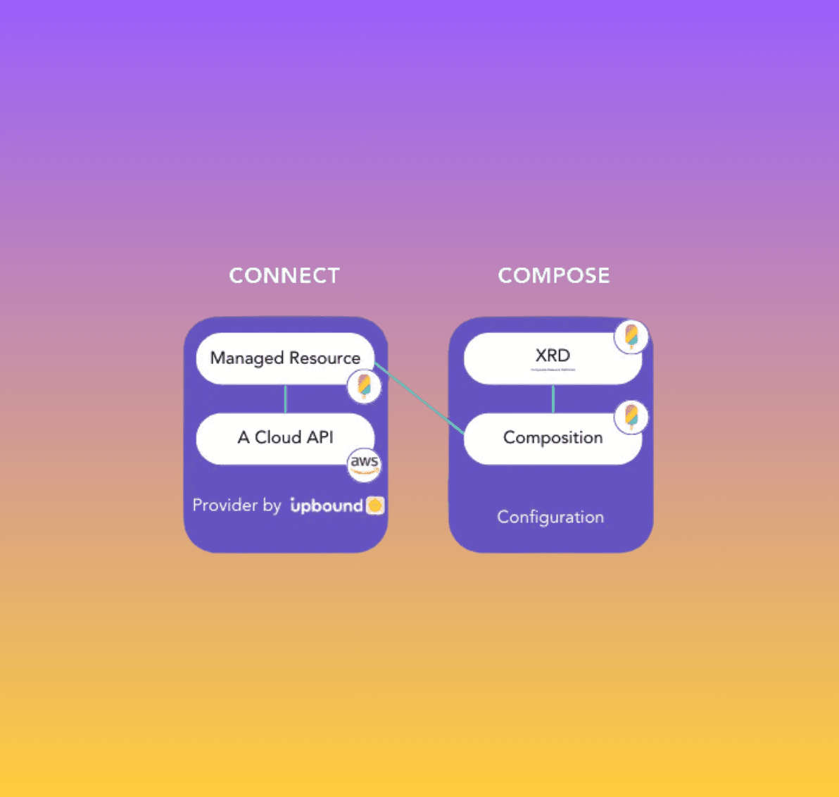 Building and using a Crossplane-based platform involves three major steps: Connect to the resources you want to manage, Compose the different resources into a custom API for your team, and finally Consume those resources by developers: