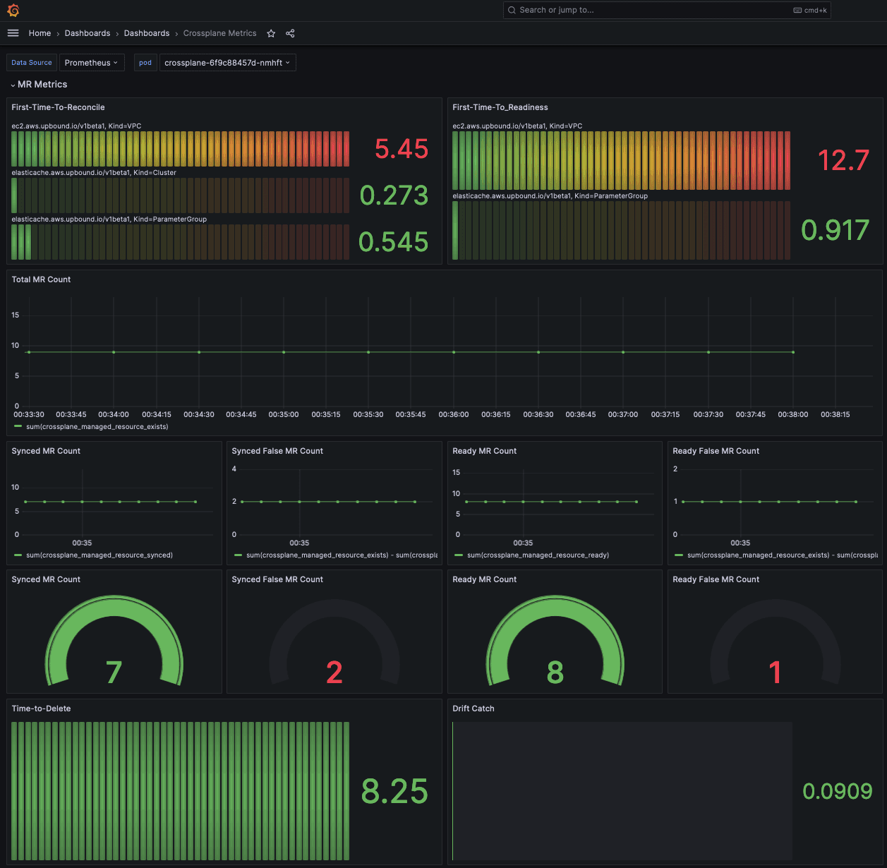 Crossplane Pod Metrics: Include controller runtime, process and go metrics that can be used to raise awareness of degrading custom platform performance. This may not yet impact the developed service level objectives to deliver infrastructure within the promised duration, but if the platform is further stretched, it can. While there is time for remediation, looking at the following information can help meet your SLO.