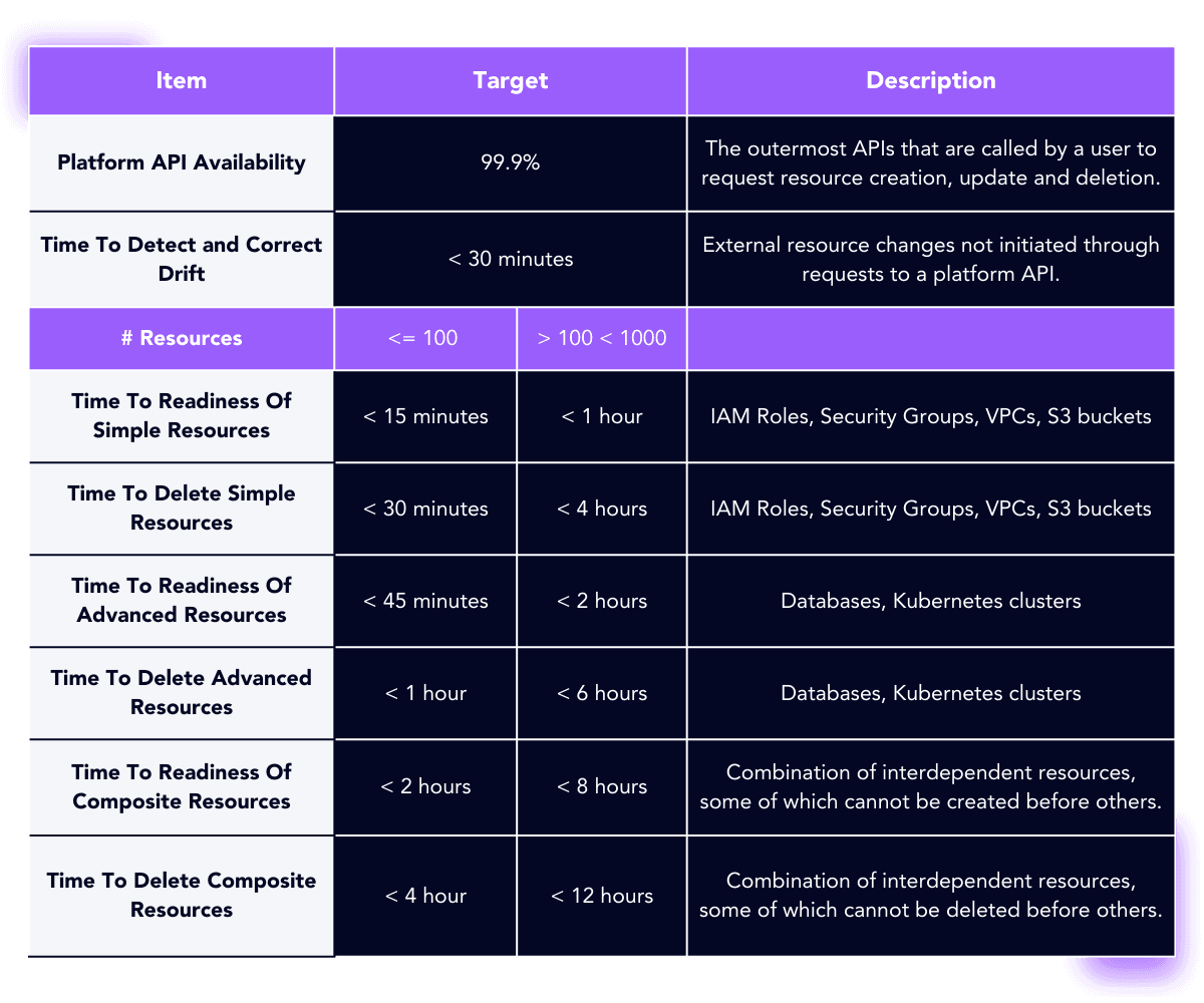 Develop independent objectives for different resource requests of interdependent resources. From a user’s perspective this would be the end-to-end duration for all resource creations to satisfy a user’s call to each particular configuration management platform API. For example, one such API call may be for an AWS EKS cluster with worker nodes, subnets, a VPC, IAM roles, and security groups.