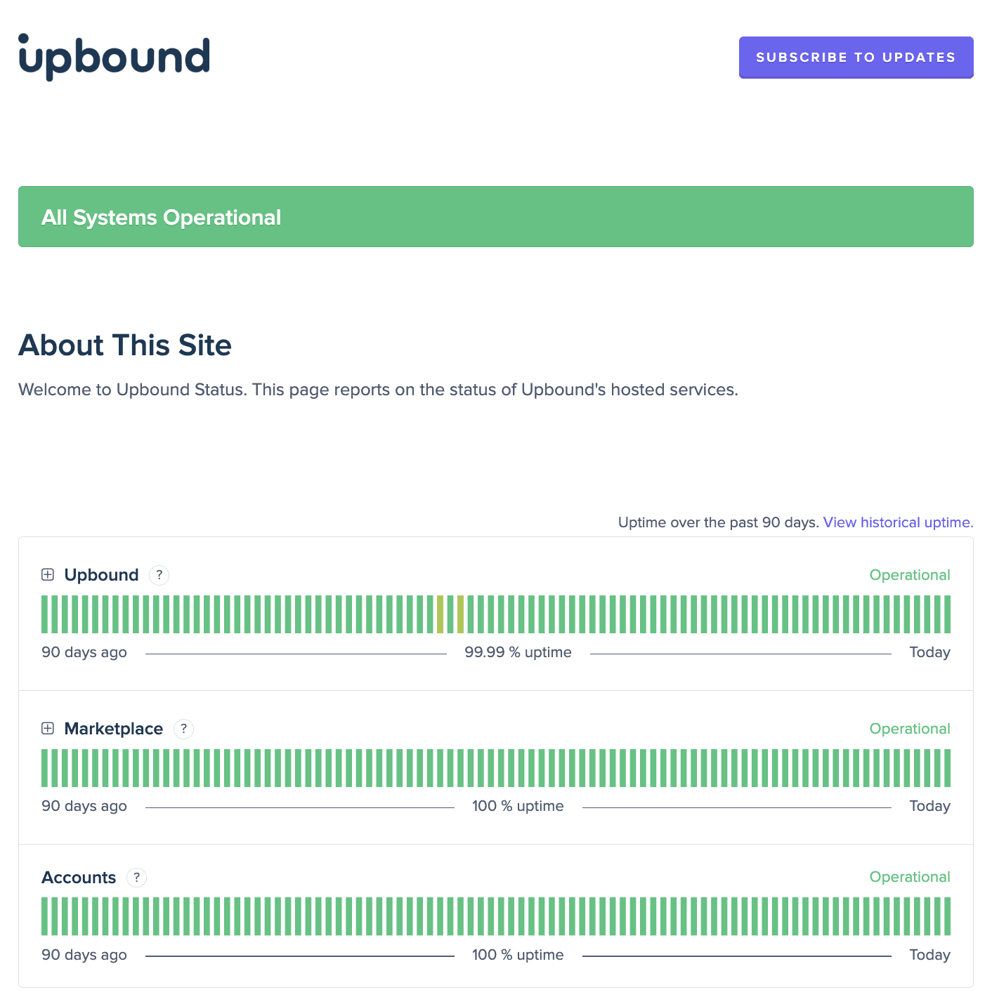 Determine the granularity of your available metrics. Upbound’s availability status page for instance distinguishes between its Upbound managed control planes services, its marketplace and its accounts availability.
