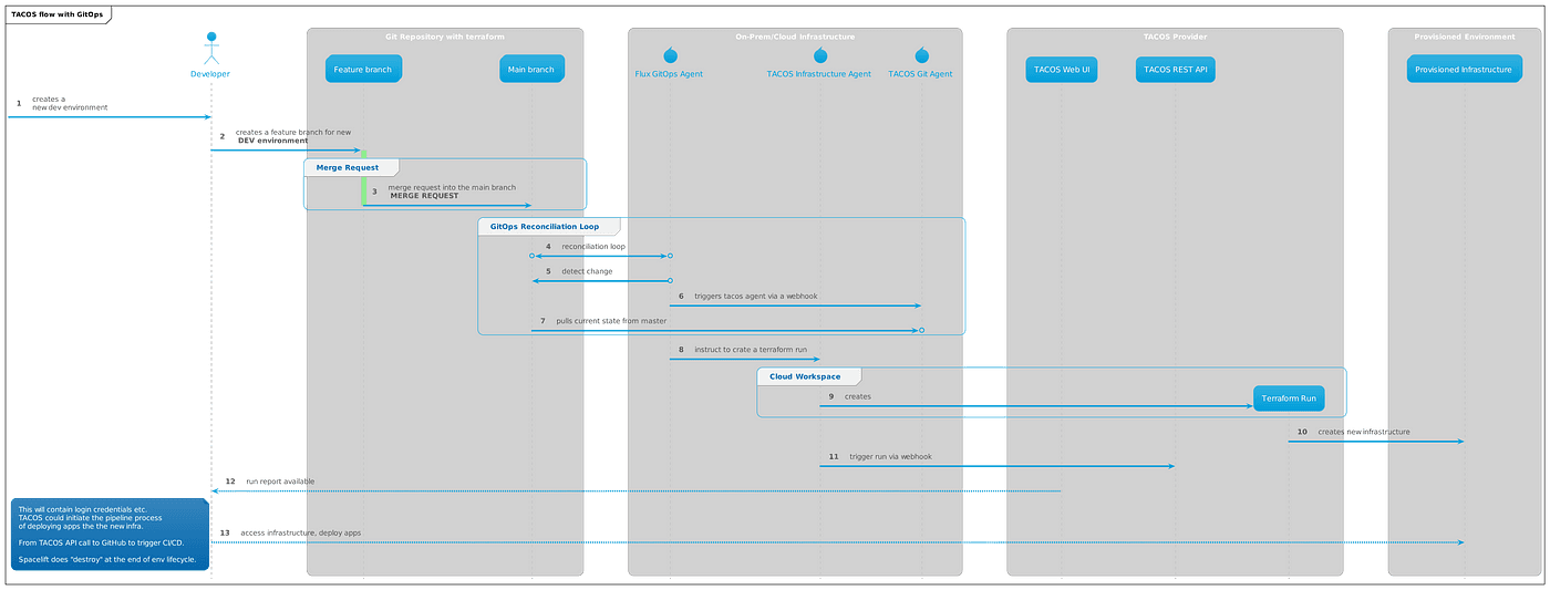 The below diagram shows a recommended TACOS flow with GitOps principles.