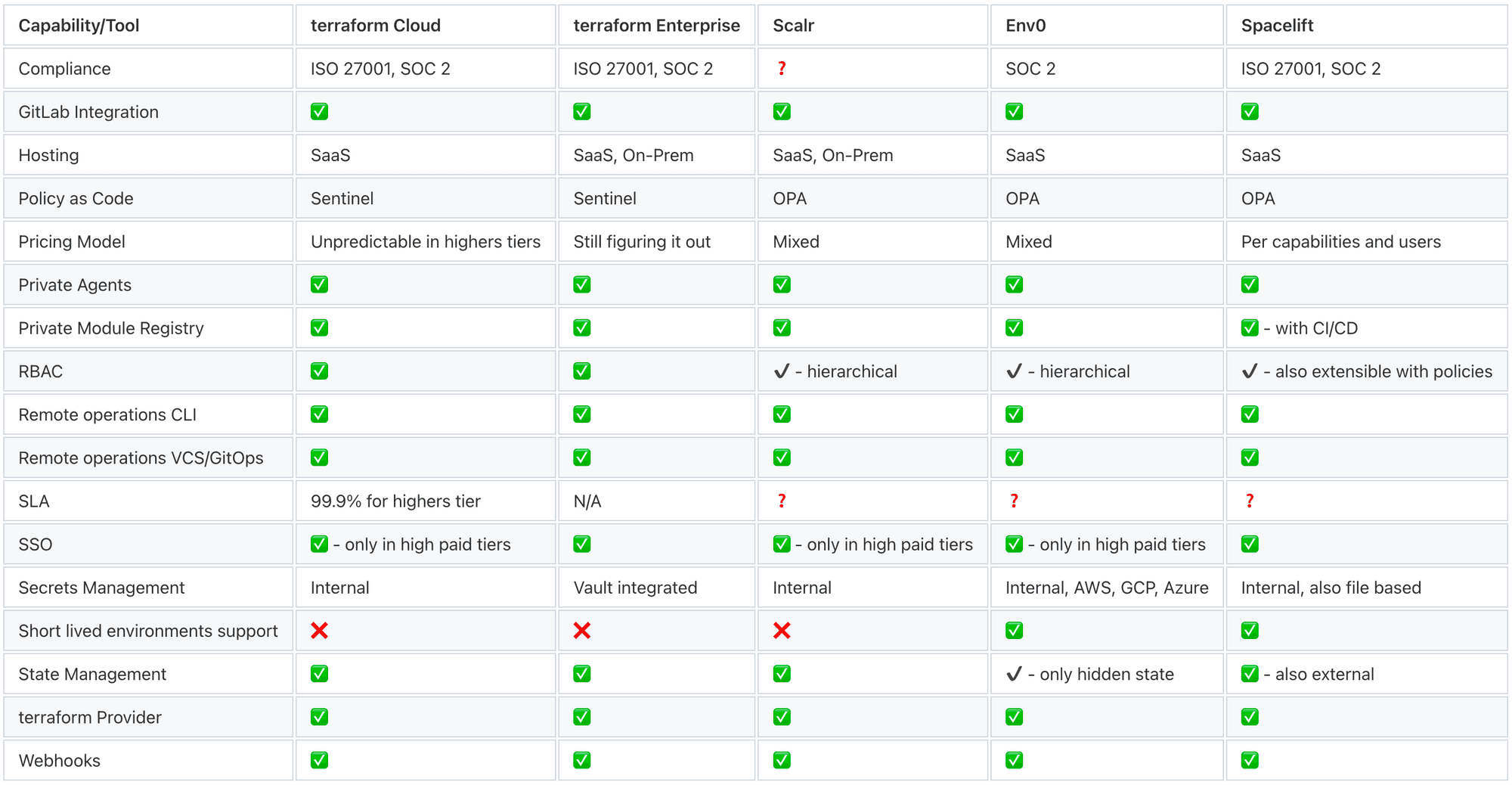 Besides the interesting features mentioned above, I also have quite a lot of concerns with other things. It doesn't provide access to state files, they are being managed somehow behind the scene. I also haven’t found any option to integrate with Terraform CLI, so it seems it doesn’t support classic remote runs like TFC or Scalr. Documentation is not providing enough details.