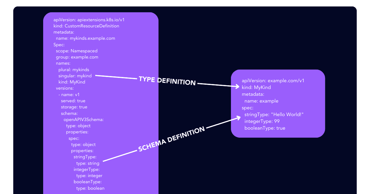 To create a new kind like MyKind, we create a CustomResourceDefinition that defines the Name, Group, Version, and the schema of our new type. The schema supports Validation, including using the Common Expression Language.
