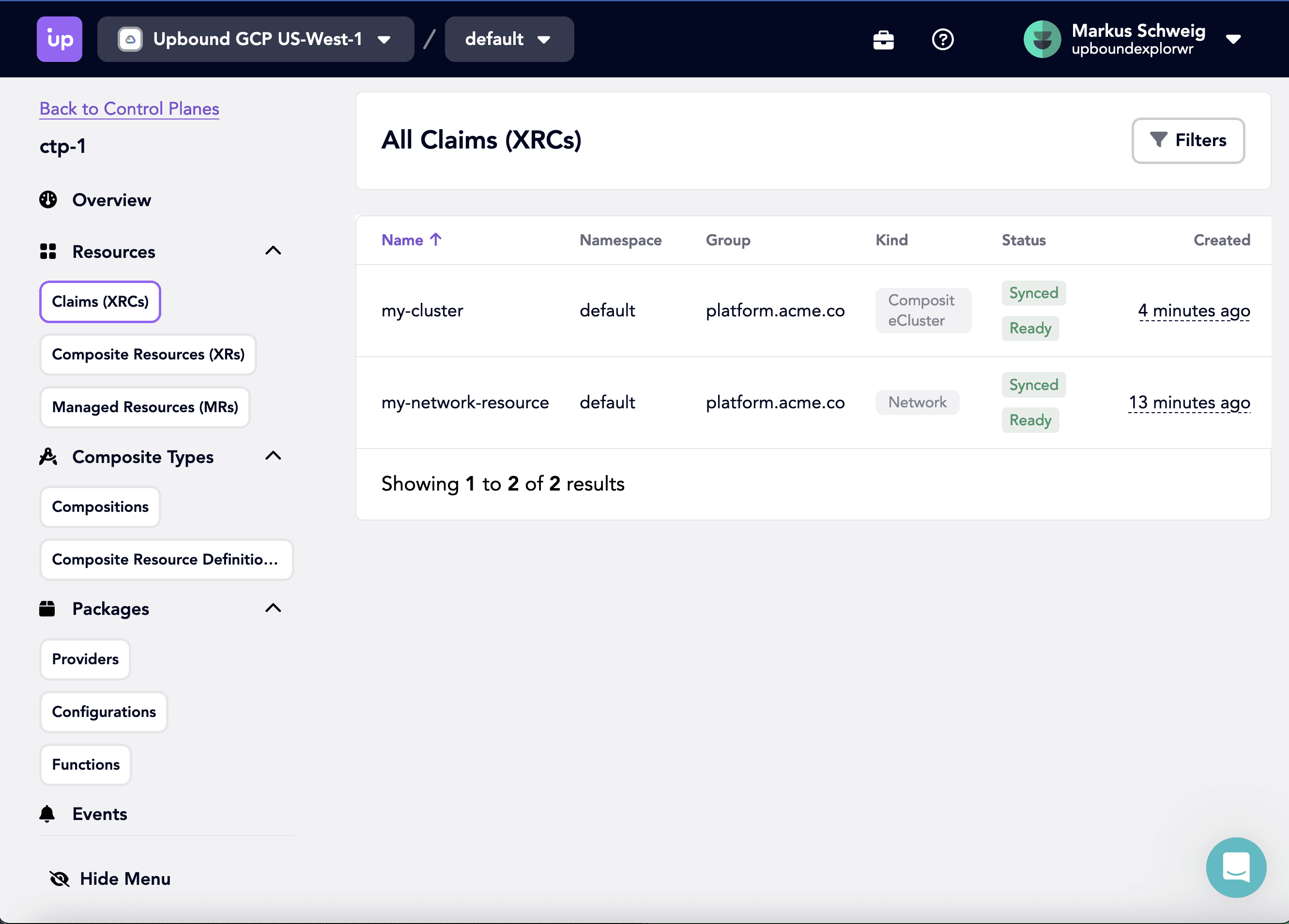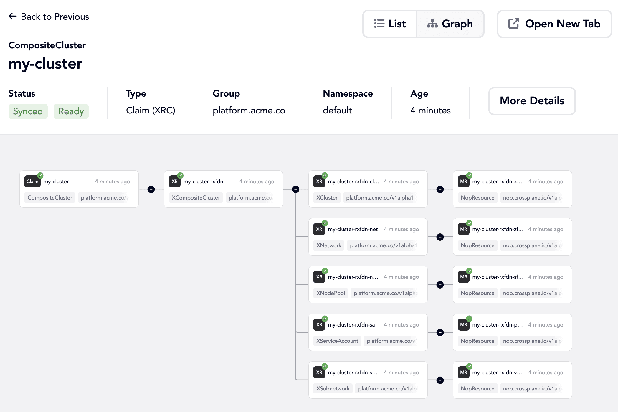A convenient sidebar menu provides quick access to relevant aspects of your resource interactions. Want to know which resource claims are running, what composite resources they created and from which managed resources? Everything is here, down to events to inform about state changes, potential errors and successes.