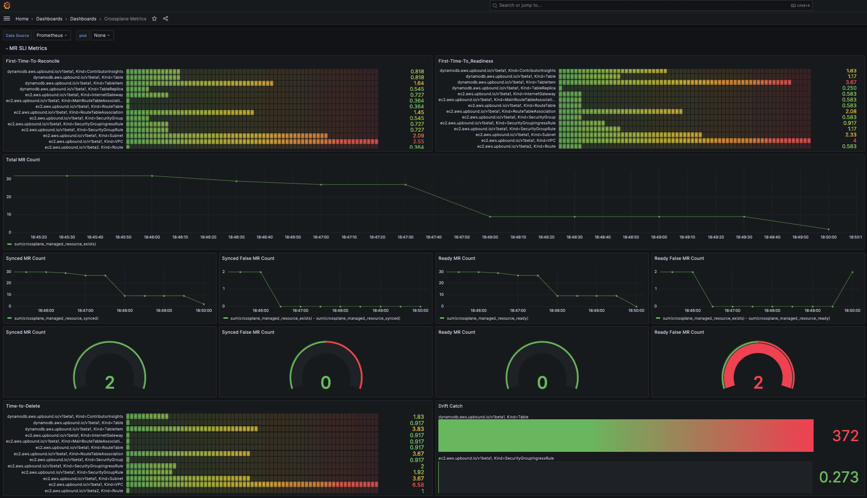 The Grafana dashboard below shows time to first reconcile and readiness, time to delete, and drift catch in addition to managed resource sync and ready status for those resources under management by your control plane.
