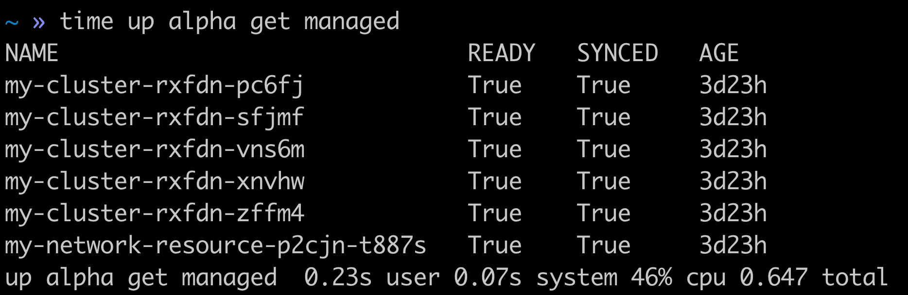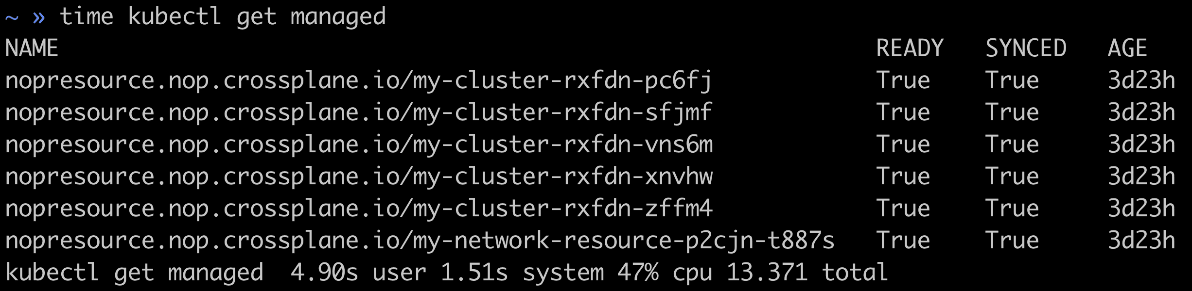 The up managed resources query returned in 0.647 seconds compared to 13.371 seconds for the same query using kubectl.