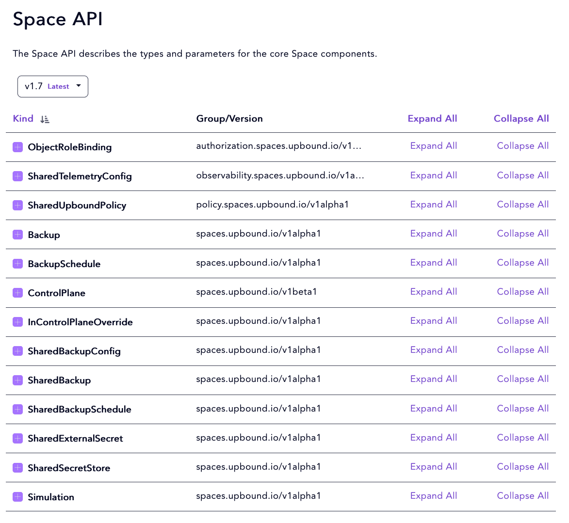 The Space API offers the following group version kind options. It is designed to interact with Upbound Spaces in a declarative way from a control plane that can also manage other control planes in Spaces.