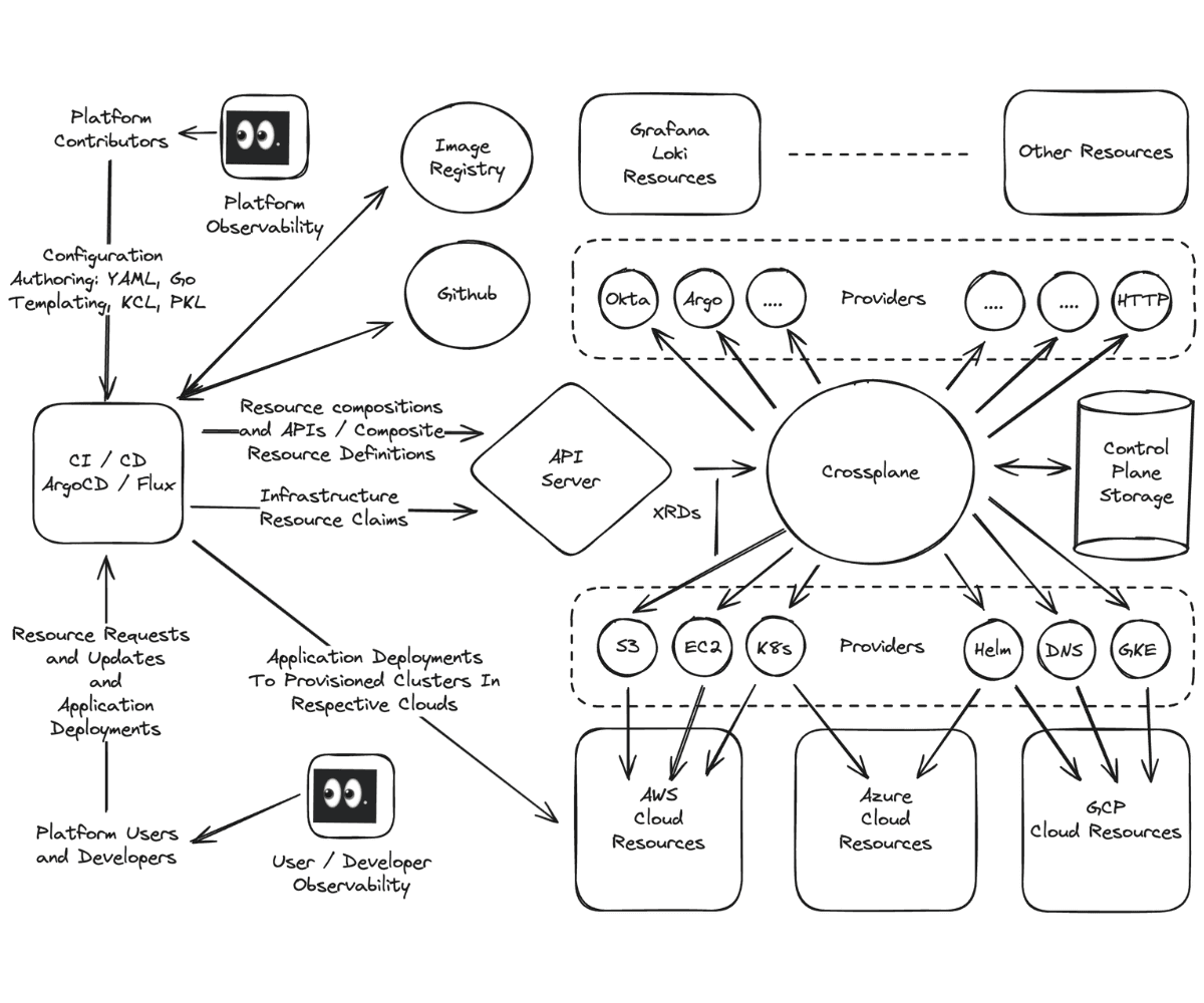 Crossplane: Crossplane acts like a universal shopping cart for your internal cloud environment. Similar to IaC, it doesn't matter if your resources are spread across different clouds, custom networking, observability, AI/ML and other providers, but with Crossplane, you can define and manage your own APIs that provide a consistent way to interact with them all. This simplifies development, reduces vendor lock-in, and empowers your developers to focus on building innovative applications.