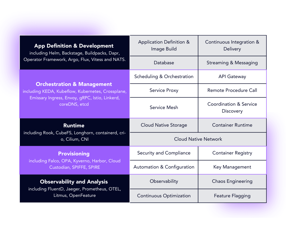 The CNCF structures its landscape of 190 projects as follows. The table below includes some graduated and incubating projects for your inspiration. Exploring the broader set of CNCF projects is well worth your time when considering their use to benefit from the advantages outlined above.